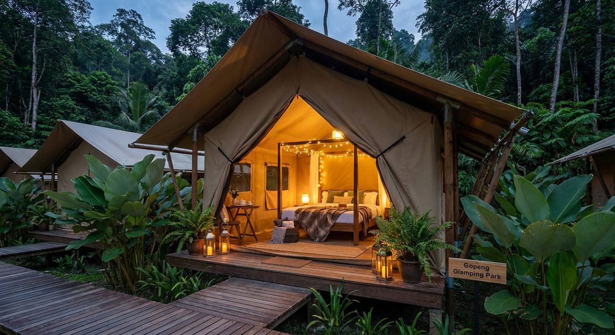 Gopeng Glamping Park merupakan destinasi glamping terbaik di Perak yang menawarkan pengalaman bermalam di tengah-tengah hutan tropika. Terletak di kawasan Gopeng yang terkenal dengan keindahan alam semula jadi, taman glamping ini menggabungkan keselesaan moden dengan suasana alam terbuka.